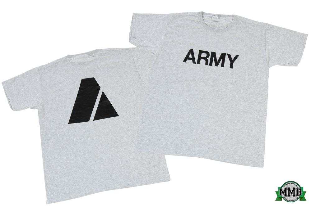 | Beschreibung | T-Shirt des Hersteller "Fruit of the Loom" in grau mit schwarzem ARMY Aufdruck in Brusthöhe sowie zusätzlichem Motivdruck auf dem Rücken. (siehe Abbildung) |